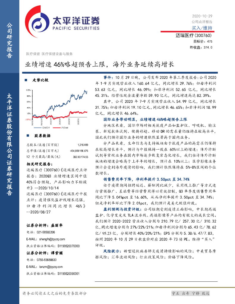 太平洋证券:迈瑞医疗(300760)-业绩增速46%略超预告上限,海外业务延续高增长.pdf
