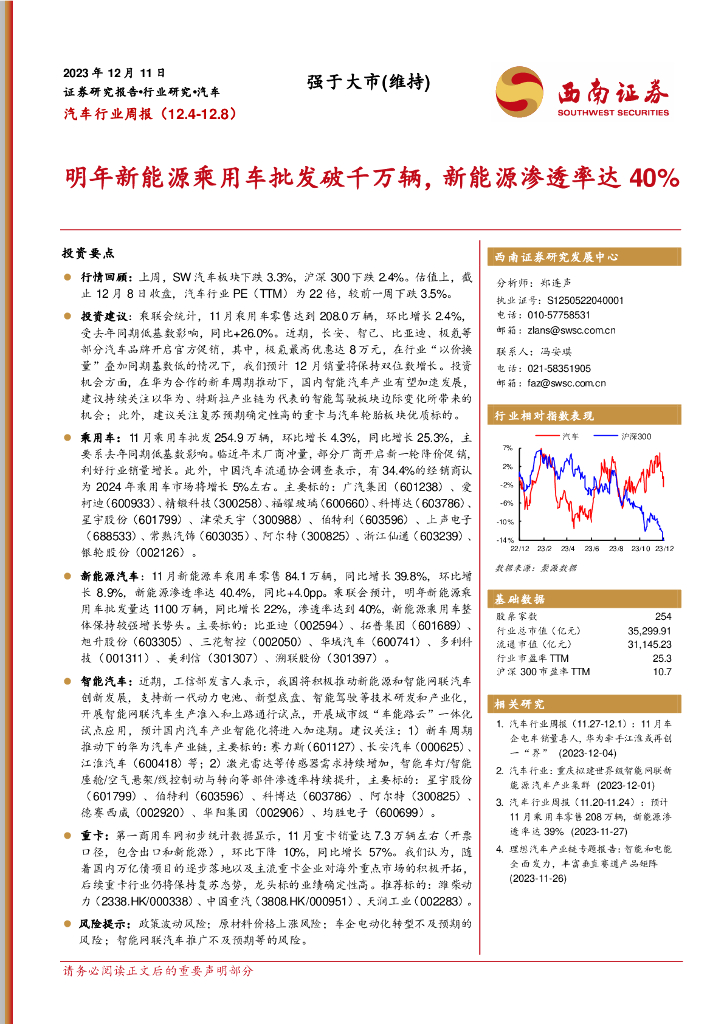 西南证券:汽车行业周报:明年新能源乘用车批发破千万辆,新能源渗透率达40%.pdf