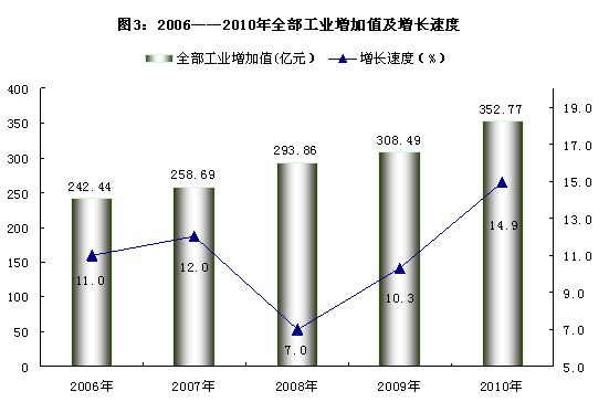 全年全部工业增加值352.77亿元,比上年增长14.9%。其中,规模以上工业增加值比上年增长15.0%。十大工业行业规模以上工业增加值比上年增长16.0%。