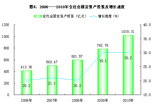 全年全社会固定资产投资完成1019.31亿元,比上年增长30.2%,其中城镇固定资产投资完成961.54亿元,比上年增长29.9%。
