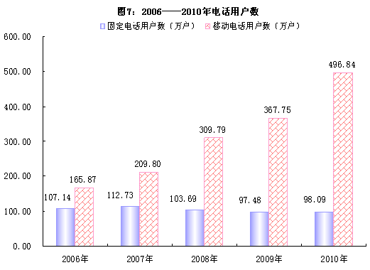 全市邮政业务总量2.66亿元,比上年增长0.5%;电信业务总量129.74 亿元,比上年增长30.2%。年末固定电话用户98.09万户,比上年增长0.6%;移动电话用户496.84万户,比上年增长35.1%;互联网宽带接入用户50.79万户,比上年增长29.6%。