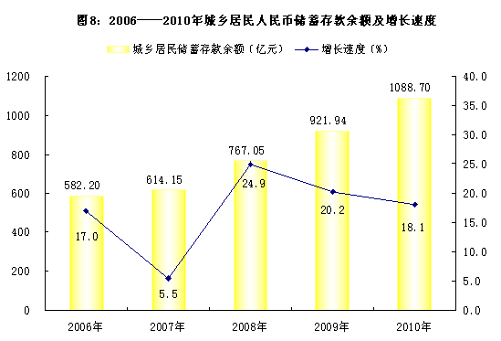 全市年末金融机构人民币各项存款余额3035.31亿元,比年初增长23.7%。其中企业存款余额1122.00亿元,比年初增长41.7%;居民储蓄存款余额1088.70亿元,比年初增长18.1%。金融机构各项贷款余额2588.73亿元,比年初增长25.0%。其中短期贷款余额536.08亿元,比年初增长35.6%;中长期贷款余额1955.21亿元,比年初增长22.9%。