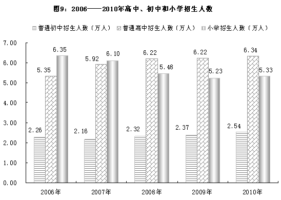 全年研究生教育招生3782人,在校生10230人,毕业生2638人;高等教育招生7.12万人,在校生26.07万人,毕业生6.44万人;中等职业教育招生6.08万人,在校生15.17万人,毕业生4.00万人;普通高中招生2.54万人,在校生6.87万人,毕业生1.89万人;普通初中招生6.34万人,在校生18.36万人,毕业生5.45万人;普通小学招生5.33万人,在校生34.47万人,毕业生6.48万人;特殊教育招生214人,在校生1592人,毕业生162人;幼儿园在园幼儿8.37万人。