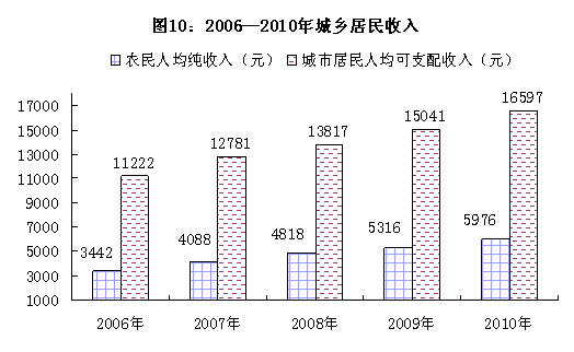 全年城市居民人均可支配收入16597元,比上年增长10.3%,扣除价格因素,实际增长7.2%;农民人均纯收入5976元,比上年增长12.4%,扣除价格因素,实际增长9.6%。