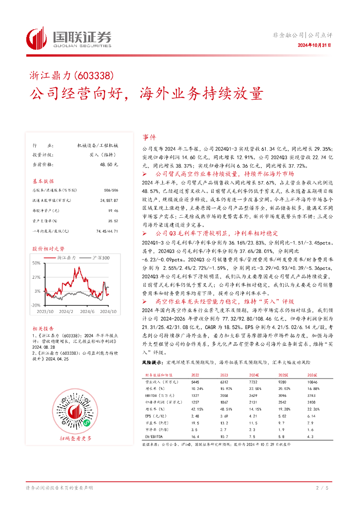 国联证券:浙江鼎力(603338)-公司经营向好,海外业务持续放量.pdf