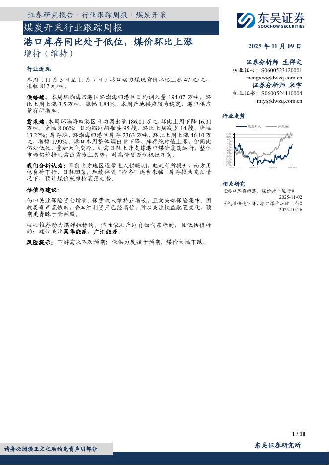 东吴证券:煤炭开采行业跟踪周报:港口库存同比处于低位,煤价环比上涨.pdf