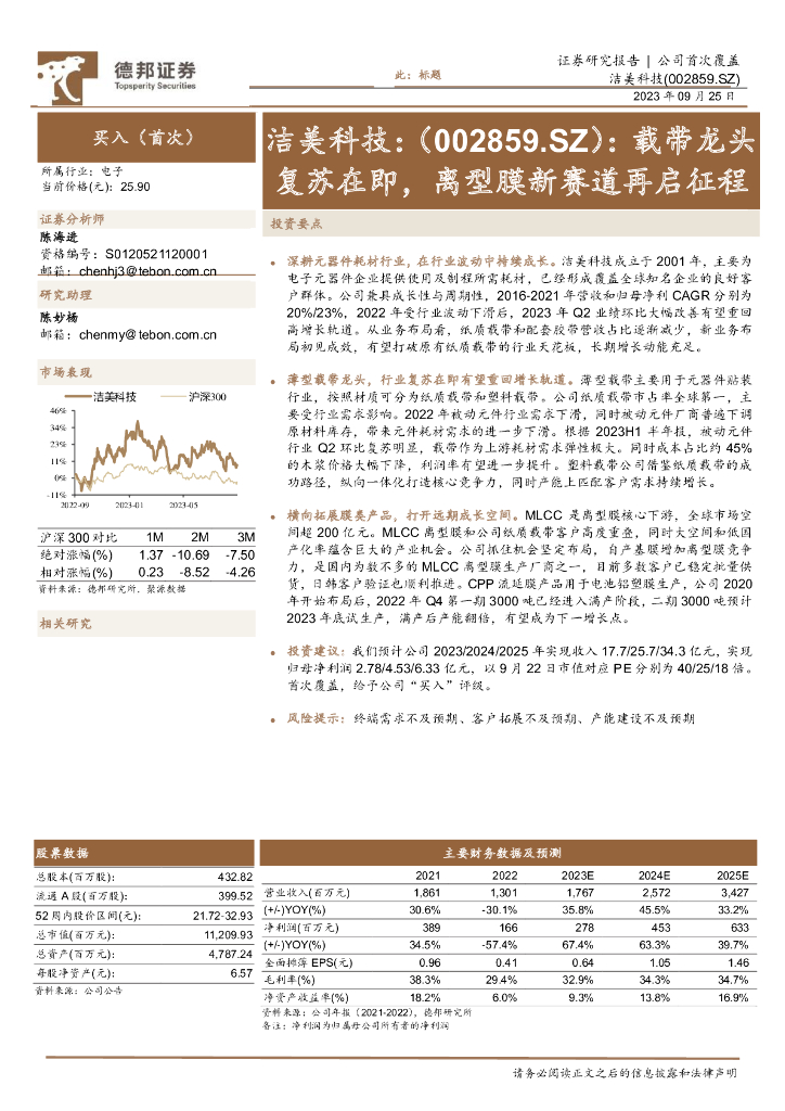 德邦证券:洁美科技(002859)-载带龙头复苏在即,离型膜新赛道再启征程.pdf