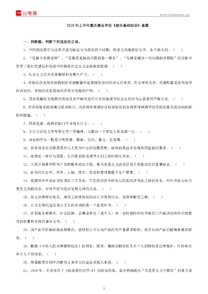 2019年上半年重庆事业单位考试《综合基础知识》真题.pdf
