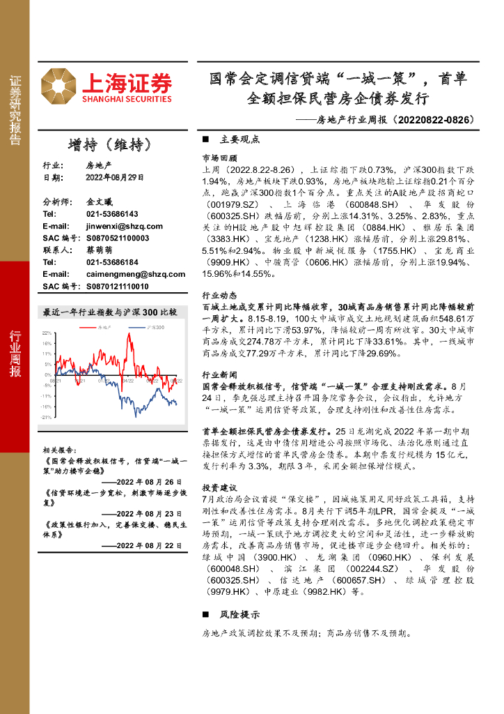 上海证券:房地产行业周报:国常会定调信贷端“一城一策”,首单全额担保民营房企债券发行.pdf