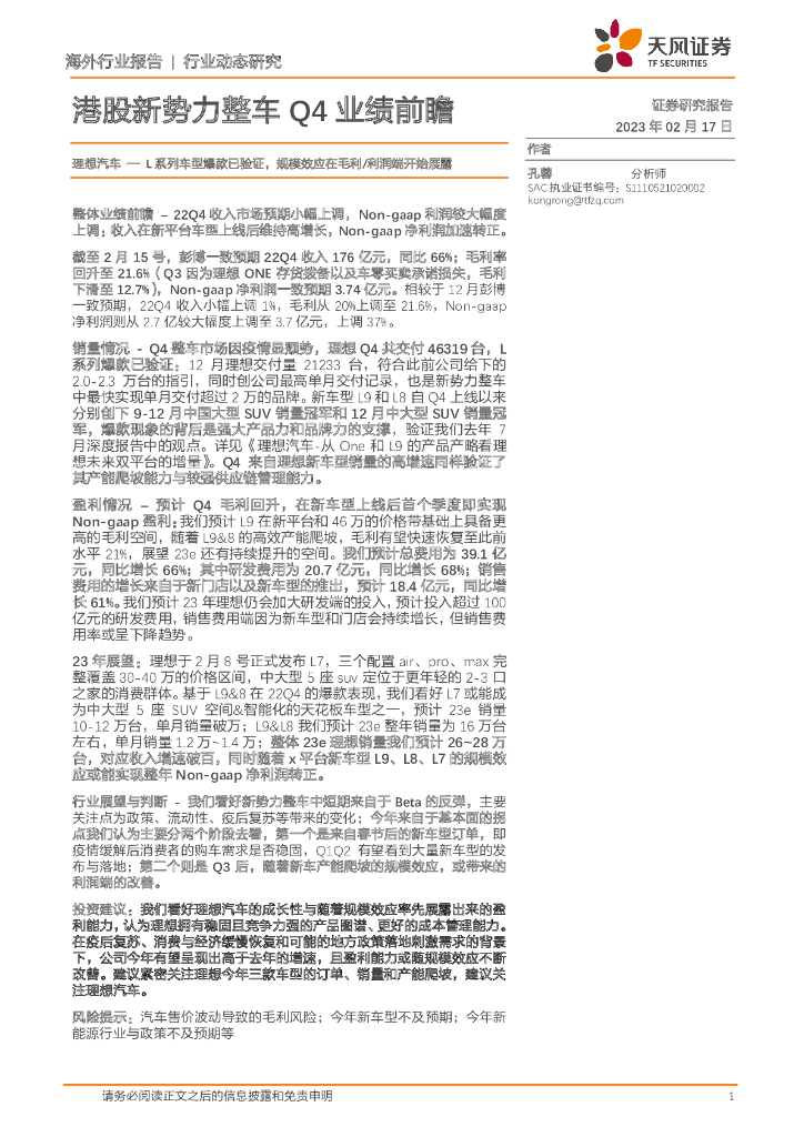 天风证券:港股新势力整车Q4业绩前瞻:理想汽车—L系列车型爆款已验证,规模效应在毛利/利润端开始展露.pdf