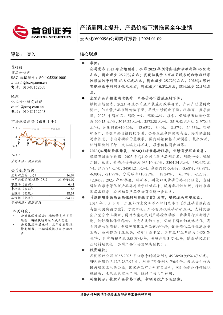 首创证券:云天化(600096)-公司简评报告:产销量同比提升,产品价格下滑拖累全年业绩.pdf