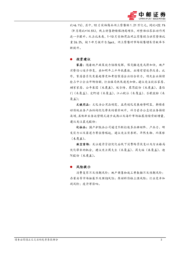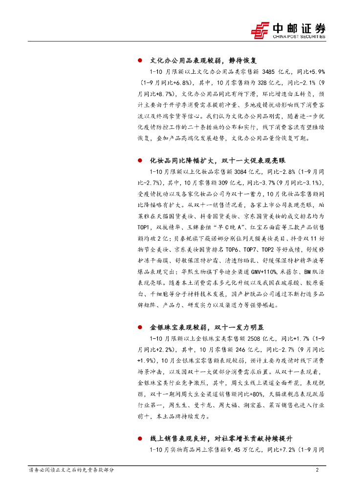 中邮证券:10月社零点评:10月社零同比略有放缓,线上销售表现良好.pdf