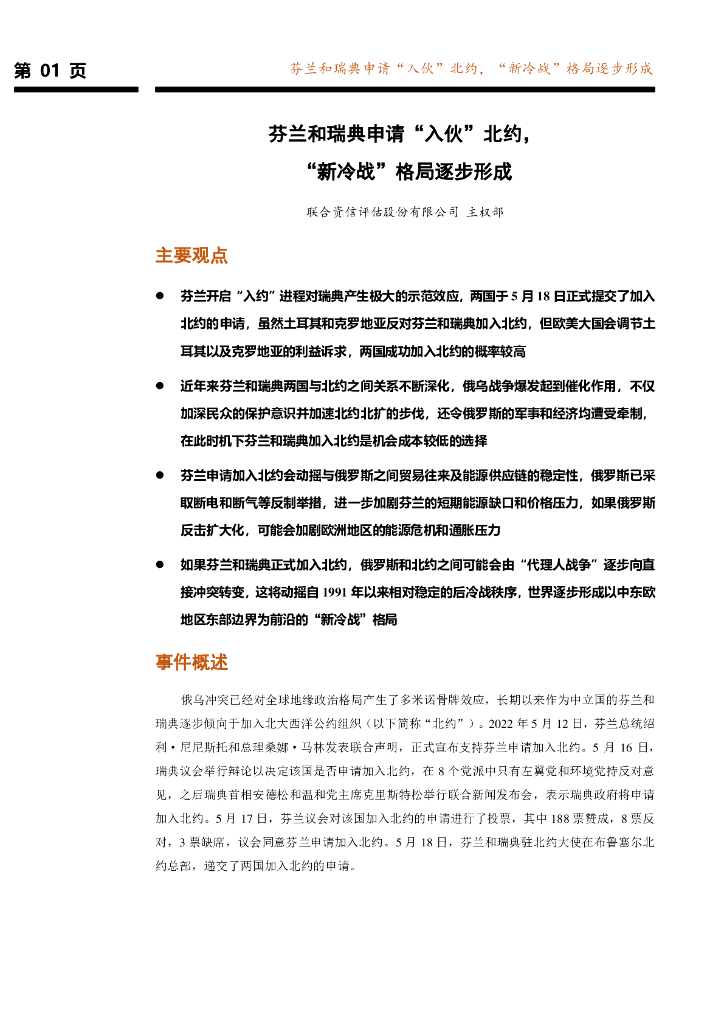 联合资信:芬兰和瑞典申请“入伙”北约,”新冷战”格局逐步形成.pdf