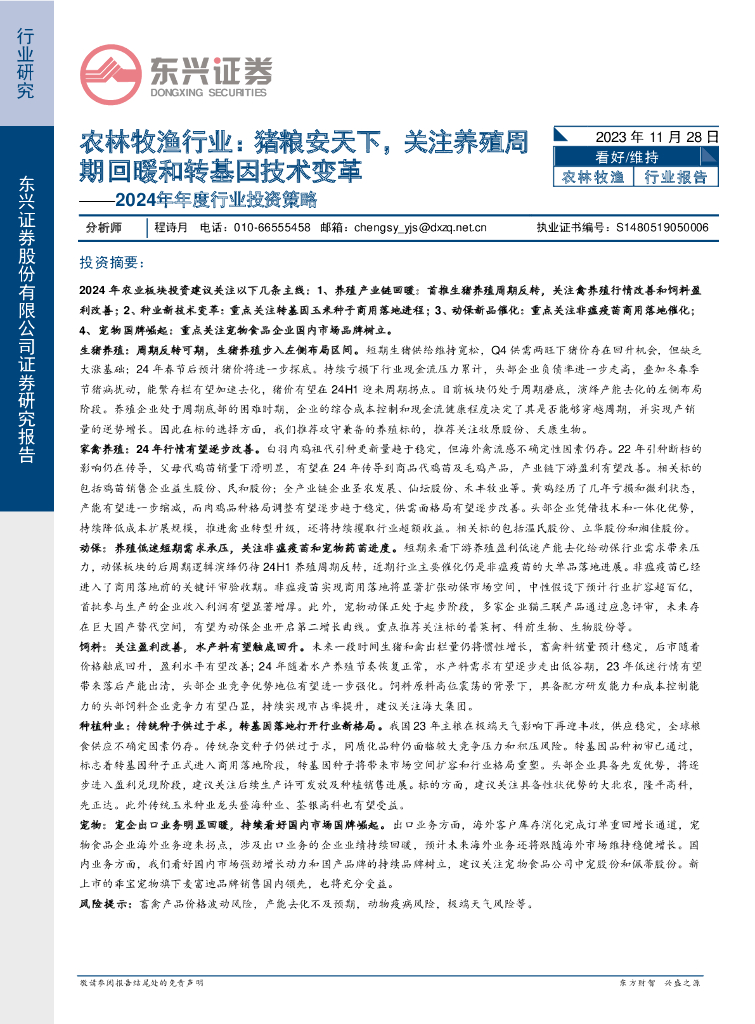 东兴证券:农林牧渔行业2024年年度行业投资策略:猪粮安天下,关注养殖周期回暖和转基因技术变革.pdf