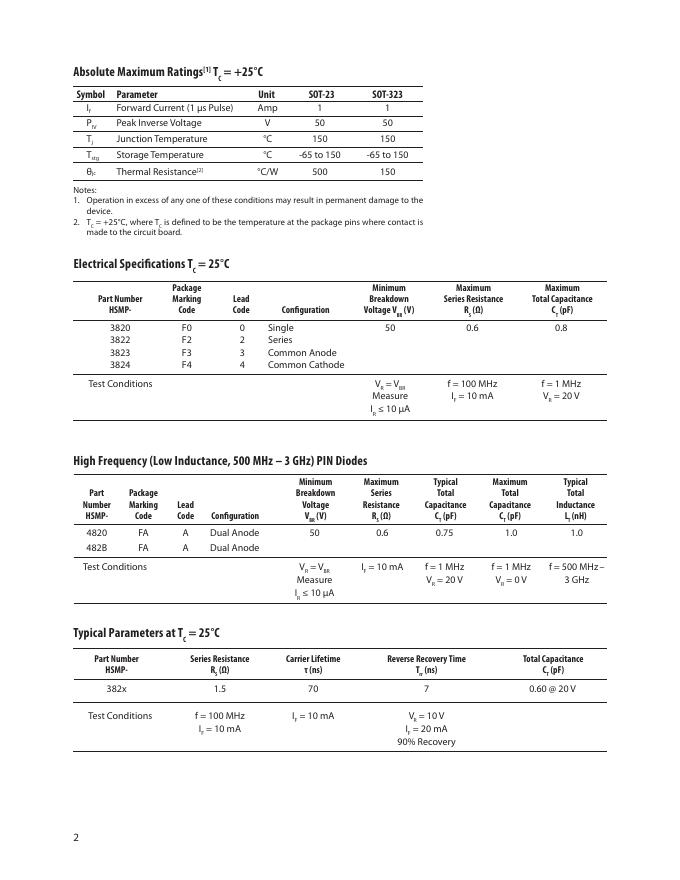 AVAGO TECHNOLOGIES HSMP-382x, 482x Surface Mount RF PIN Switch and Limiter Diodes 数据手册.pdf
