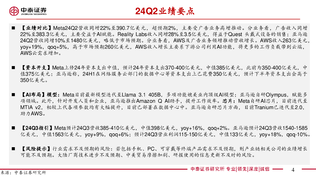 中泰证券:【中泰电子】AI全视角-科技大厂财报专题|Meta&亚马逊24Q2季报点评:资本开支增长强劲,云业务亮眼.pdf