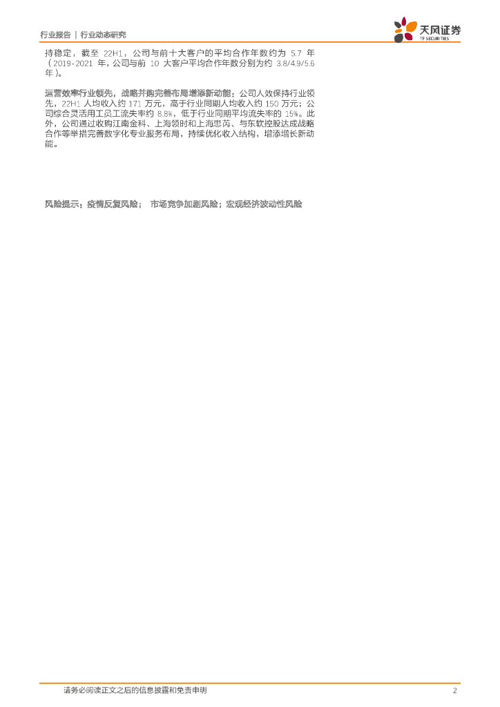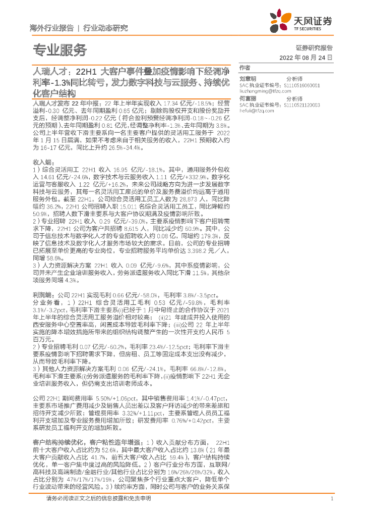 天风证券:专业服务行业动态研究:人瑞人才:22H1大客户事件叠加疫情影响下经调净利率-1.3%同比转亏,发力数字科技与云服务、持续优化客户结构.pdf
