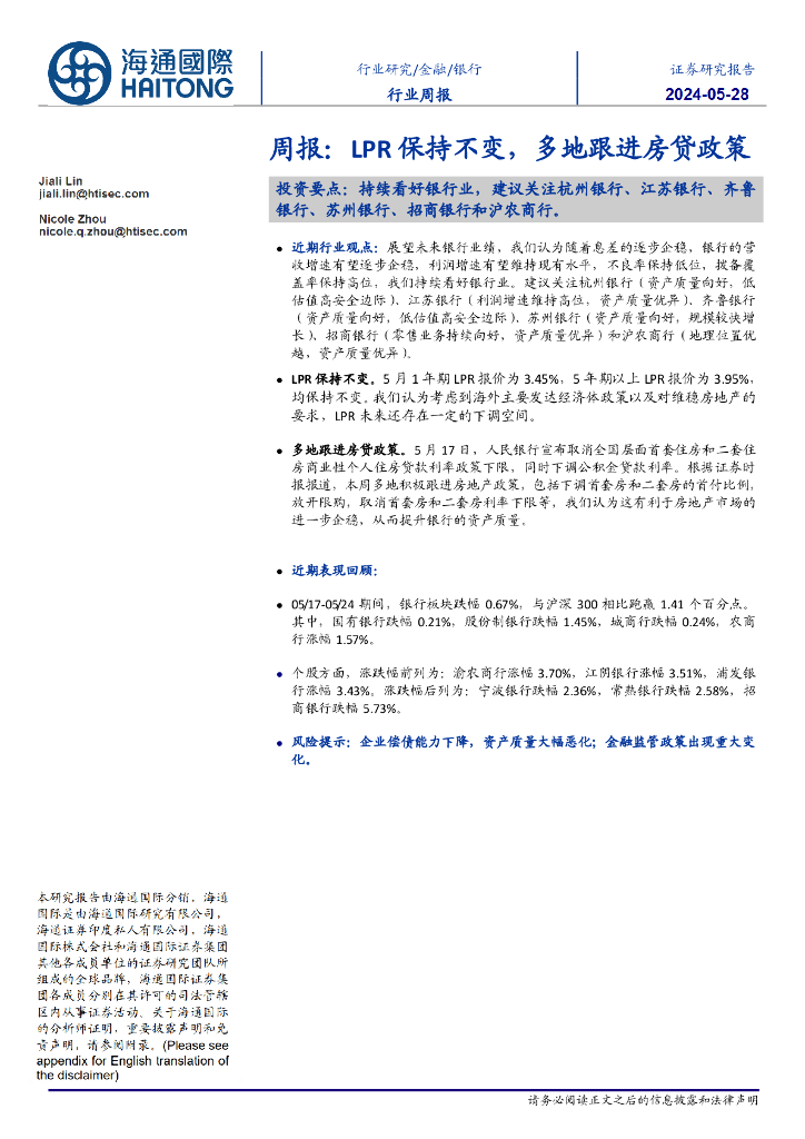 海通国际:银行行业周报:LPR保持不变,多地跟进房贷政策.pdf