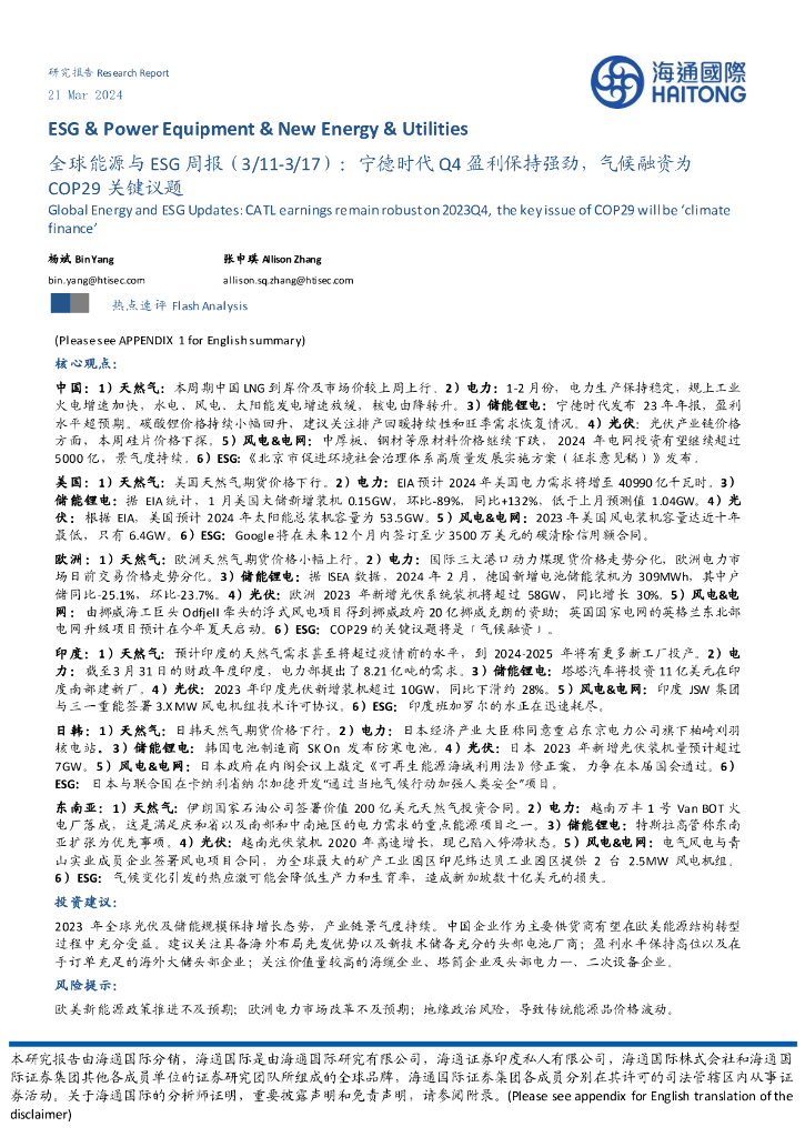 海通国际:全球能源与ESG周报:宁德时代Q4盈利保持强劲,气候融资为COP29关键议题.pdf