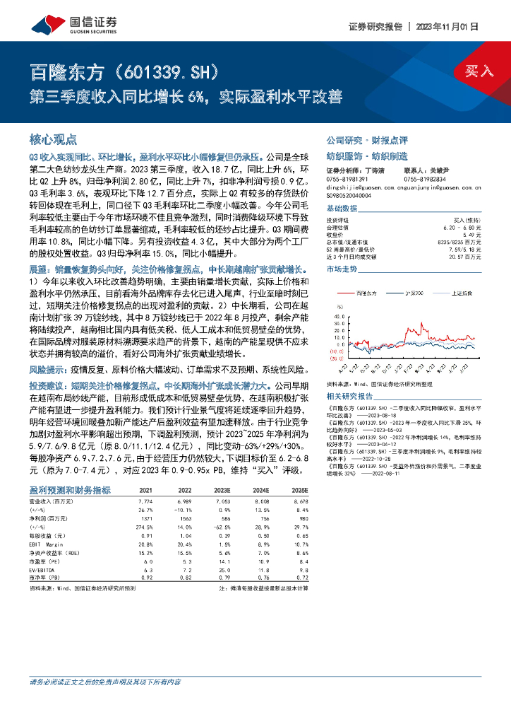 国信证券:百隆东方(601339)-第三季度收入同比增长6%,实际盈利水平改善.pdf