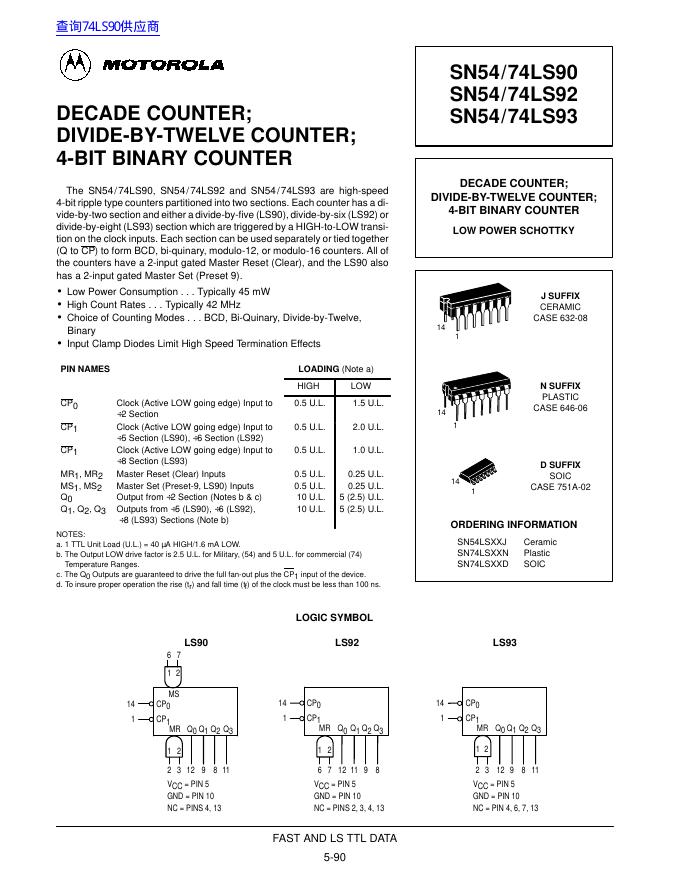 MOTOROLA SN54/74LS90 SN54/74LS92 SN54/74LS93 DECADE COUNTER; DIVIDE-BY-TWELVE COUNTER; 4-BIT BINARY COUNTER 数据手册.pdf