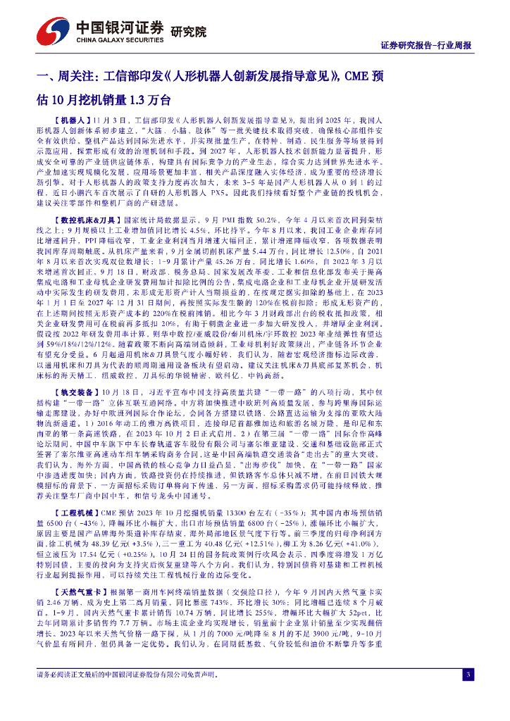 中国银河:机械设备行业周报:工信部印发《人形机器人创新发展指导意见》,CME预估10月挖机销量1.3万台.pdf