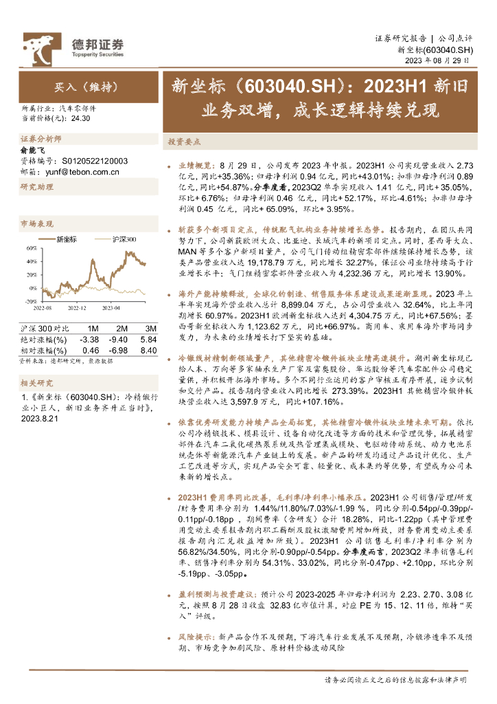 德邦证券:新坐标(603040)-2023H1新旧业务双增,成长逻辑持续兑现.pdf