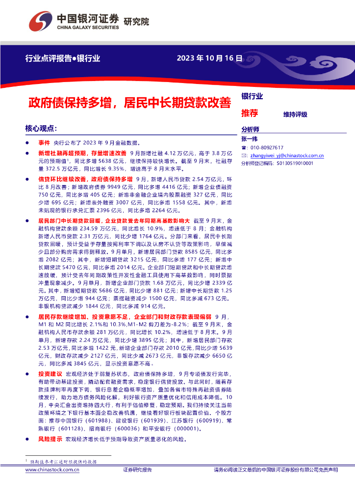 中国银河:银行业:政府债保持多增,居民中长期贷款改善.pdf