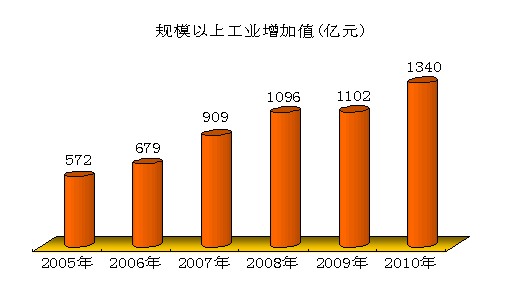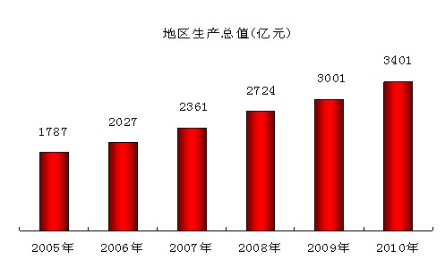 全市经济平稳较快发展。初步核算,2010年全市实现生产总值3401.0亿元,比上年增长12.2%。其中,第一产业增加值370.0亿元,增长2.7%;第二产业增加值1653.8亿元,增长13.1%;第三产业增加值1377.2亿元,增长13.1%。三次产业结构比例为10.9:48.6:40.5。