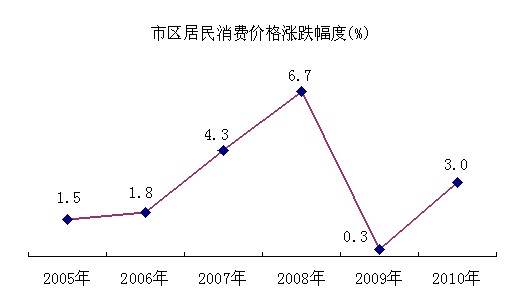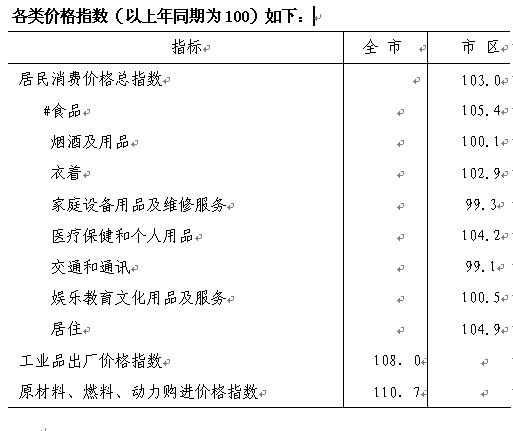 物价总水平呈上涨态势。全年市区居民消费价格指数比上年上涨3.0%,其中食品价格上涨5.4%。全年全市工业品出厂价格指数比上年上涨8.0%,原材料、燃料动力购进价格指数比上年上涨10.7%。