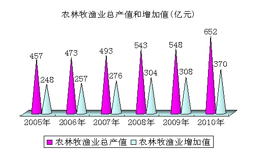 农村经济平稳增长。全市农林牧渔业总产值651.6亿元,比上年增长3.1%,其中农业产值358.8亿元,增长1.4%,畜牧业产值259.7亿元,增长5.0%,农林牧渔服务业产值23.5亿元,增长8.0%。农林牧渔业增加值369.6亿元,比上年增长2.7%。