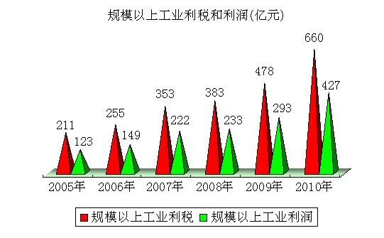 工业效益大幅提高。规模以上工业实现主营业务收入5821.1亿元,比上年增长33.3%;实现利税659.8亿元,增长37.1%;其中利润427.1亿元,增长44.7%。