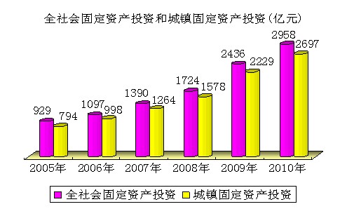 固定资产投资较快增长。2010年全社会固定资产投资2958.0亿元,比上年增长21.4%,其中城镇固定资产投资2696.8亿元,增长21.0%。