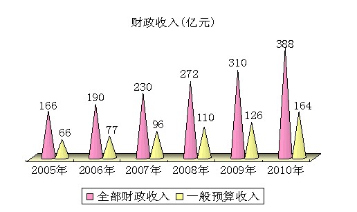 财政收入快速增长。2010年全市全部财政收入387.9亿元,比上年增长25.0%,其中一般预算收入163.6亿元,增长29.9%。在全部税收中,增值税109.6亿元,增长13.8%;营业税68.4亿元,增长32.3%;企业所得税63.9亿元,增长20.5%。全市一般预算支出290.5亿元,增长20.6%,其中环境保护支出8.6亿元,增长8.4%;医疗卫生支出27.3亿元,增长32.1%;教育支出68.0亿元,增长11.0%;农林水事务支出24.4亿元,增长8.1%;社会保障和就业支出23.0亿元,增长11.4%。
