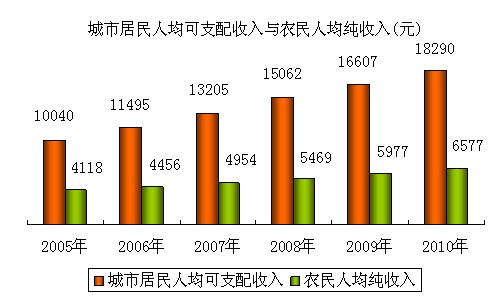 城乡居民收入稳定增长。全市城市居民人均可支配收入18290元,比上年增长10.1%,农民人均纯收入为6577元,增长10.0%;城市居民人均消费支出10568元,增长4.9%,农村居民人均生活消费支出3956元,增长14.9%。