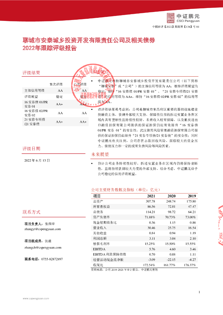 鹏元:聊城市安泰城乡投资开发有限责任公司及相关债券2022年跟踪评级报告.pdf