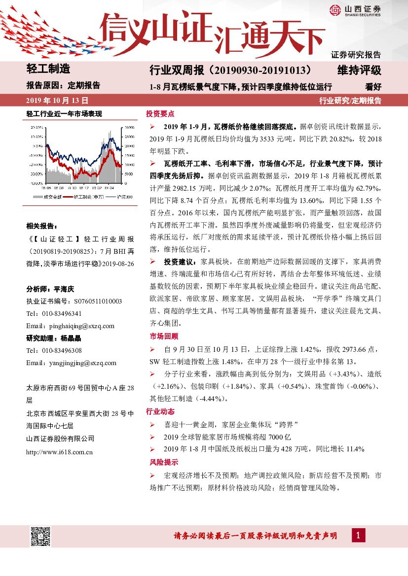 山西证券:轻工制造行业双周报:1-8月瓦楞纸景气度下降,预计四季度维持低位运行.pdf
