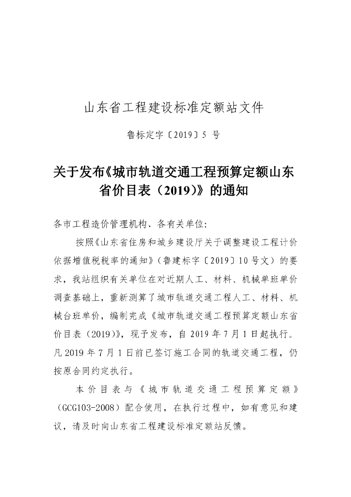 山东省工程建设标准定额站:城市轨道交通工程预算定额山东省价目表(2019).pdf