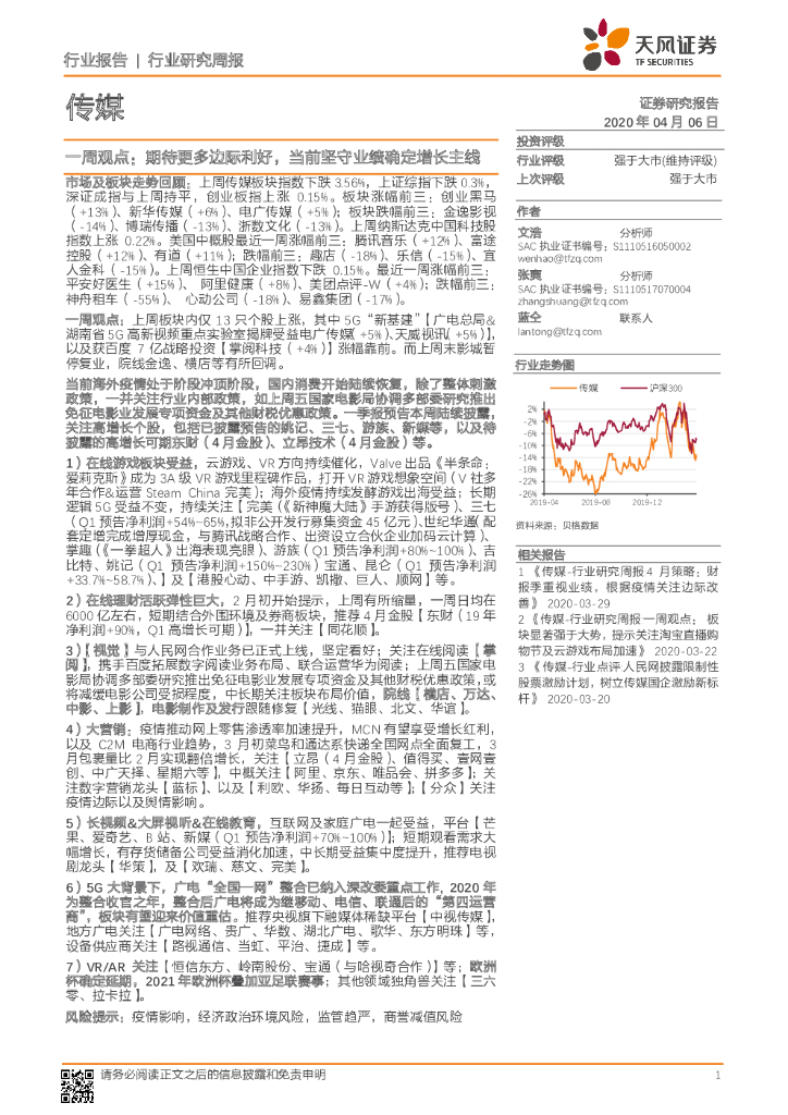 天风证券:传媒:一周观点:期待更多边际利好,当前坚守业绩确定增长主线.pdf