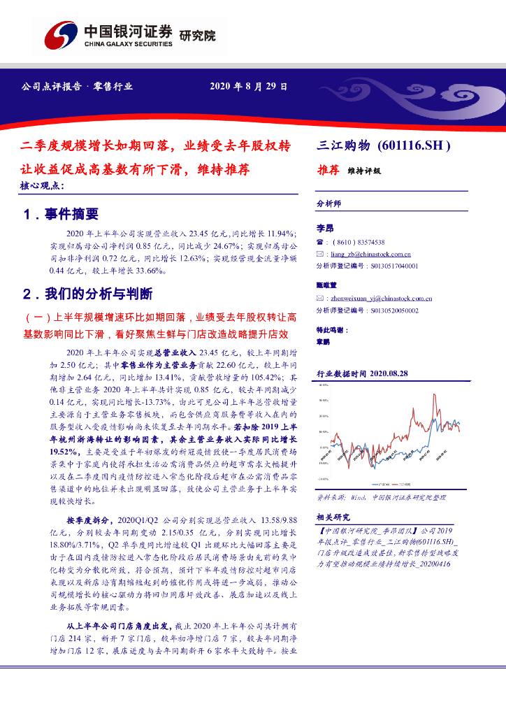中国银河:三江购物(601116)-二季度规模增长如期回落,业绩受去年股权转让收益促成高基数有所下滑,维持推荐.pdf