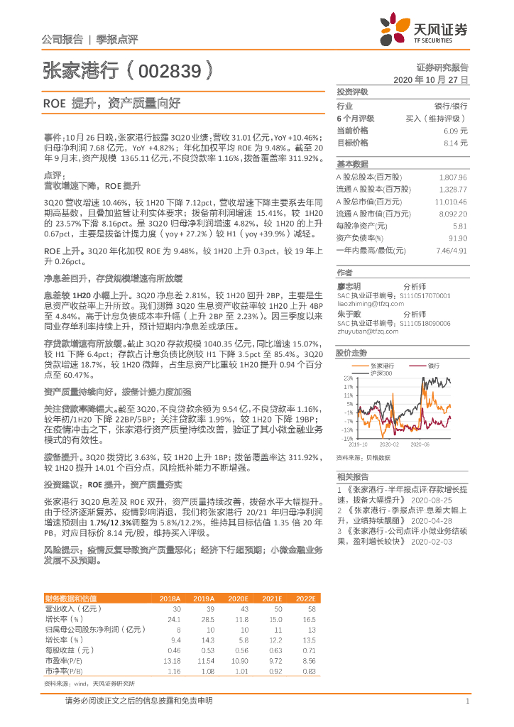 天风证券:张家港行(002839)-ROE提升,资产质量向好.pdf