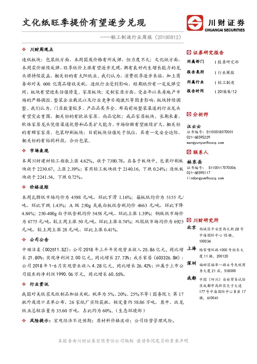 川财证券:轻工制造行业周报:文化纸旺季提价有望逐步兑现.pdf