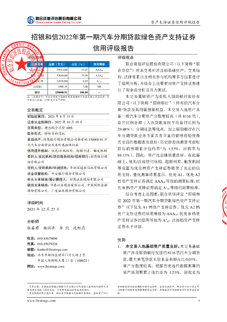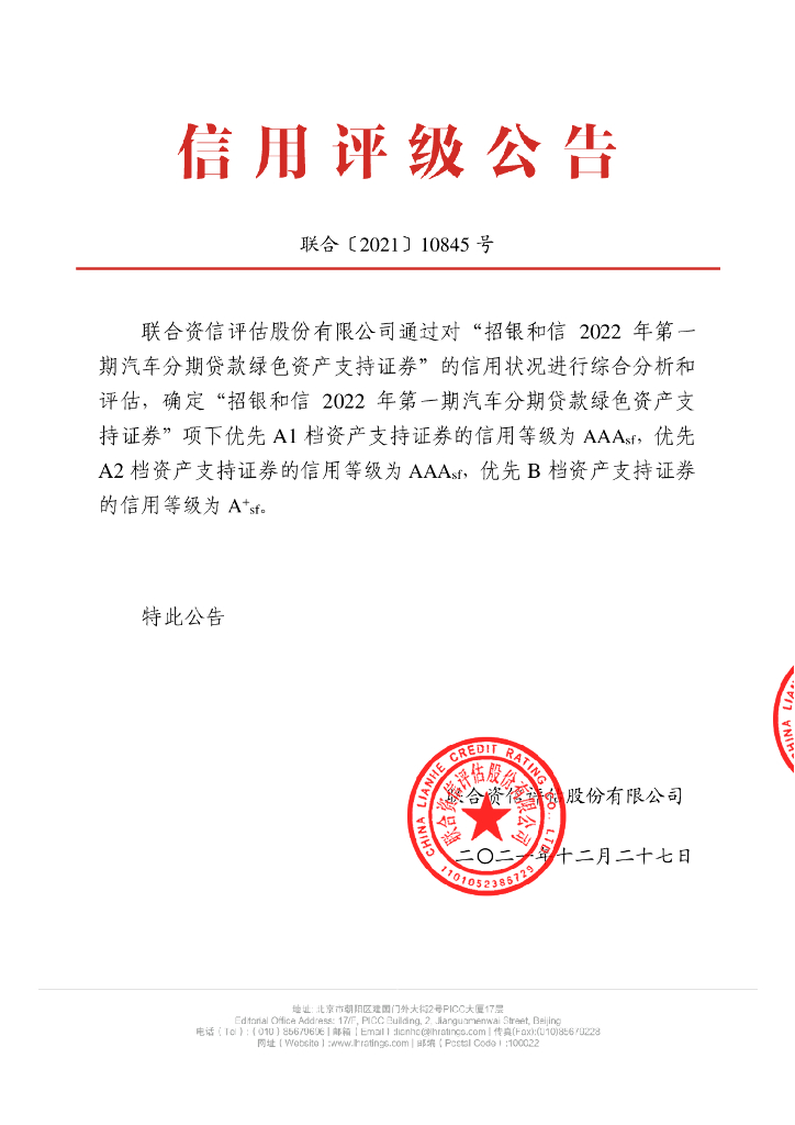 联合资信:招银和信2022年第一期汽车分期贷款绿色资产支持证券售前评级报告及持续跟踪评级说明.pdf