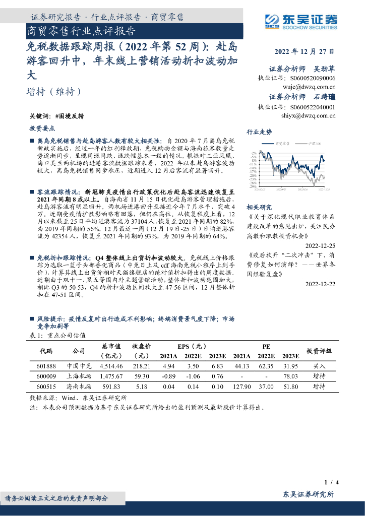 东吴证券:商贸零售行业点评报告:免税数据跟踪周报(2022年第52周):赴岛游客回升中,年末线上营销活动折扣波动加大.pdf