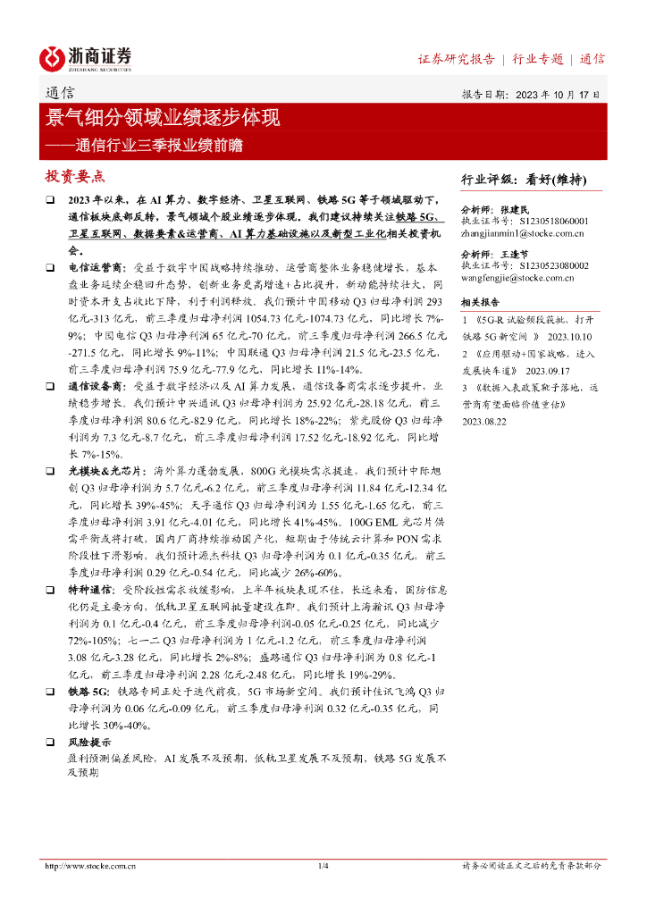 浙商证券:通信行业三季报业绩前瞻:景气细分领域业绩逐步体现.pdf