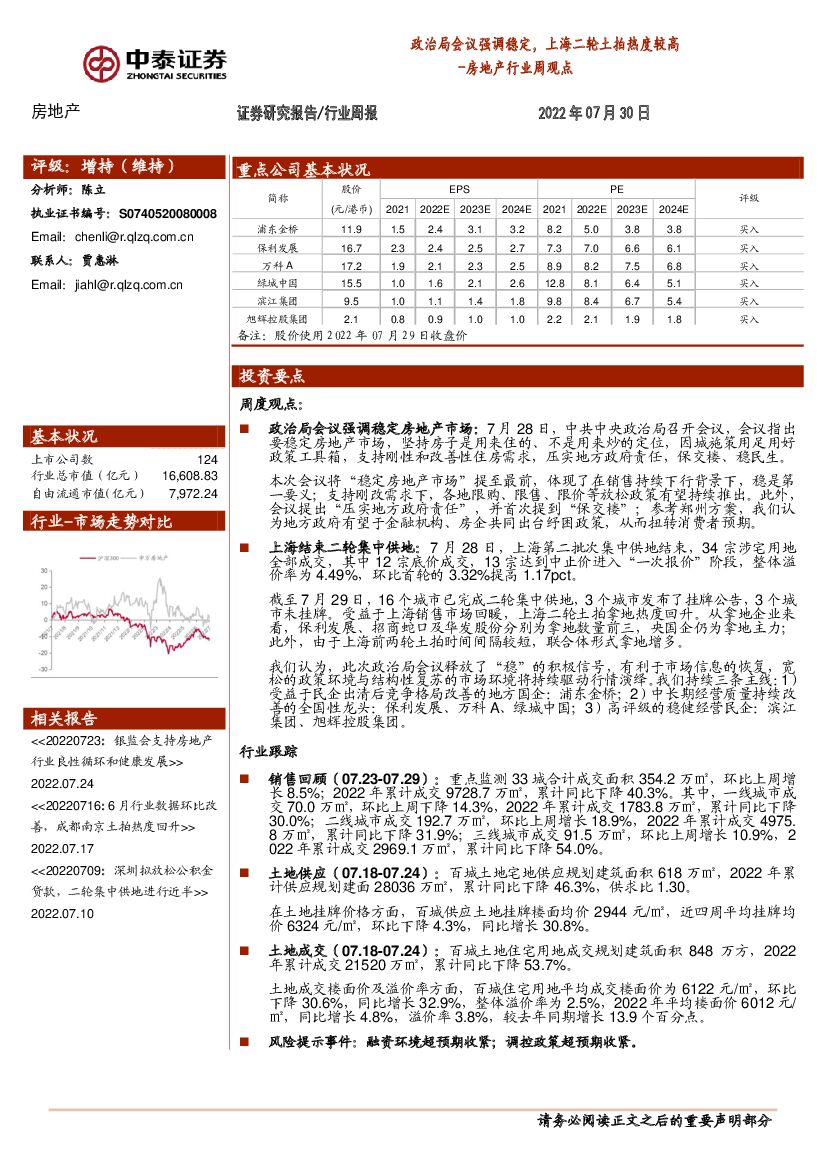 中泰证券:房地产行业周观点:政治局会议强调稳定,上海二轮土拍热度较高.pdf
