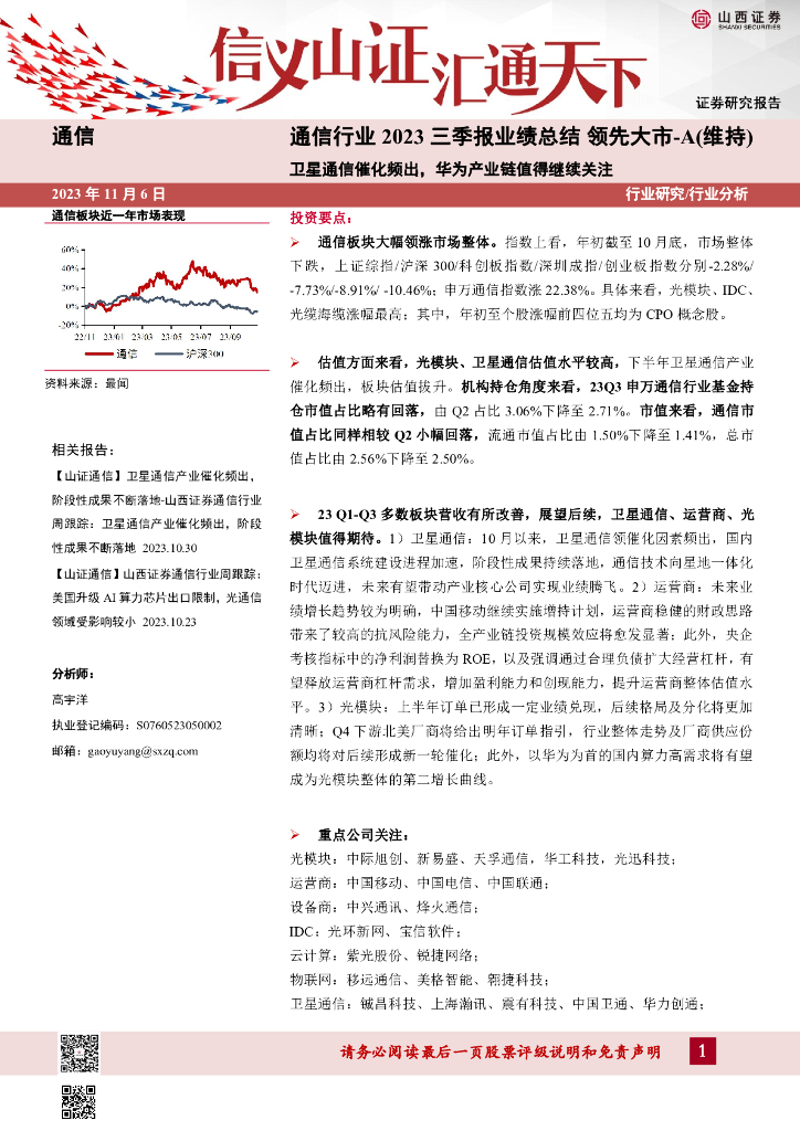 山西证券:通信行业2023三季报业绩总结:卫星通信催化频出,华为产业链值得继续关注.pdf