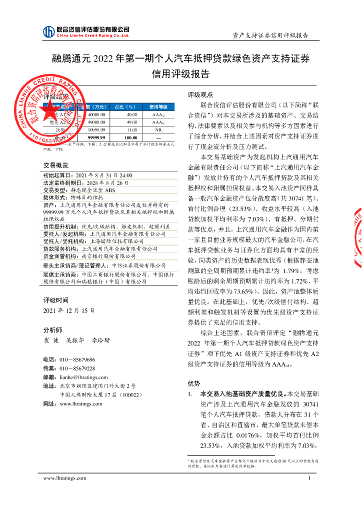 联合资信:融腾通元2022年第一期个人汽车抵押贷款绿色资产支持证券_联合资信售前评级报告及跟踪评级安排.pdf