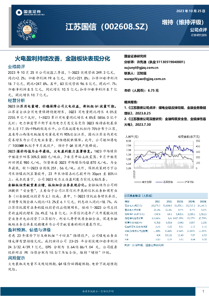 国金证券:江苏国信(002608)-火电盈利持续改善,金融板块表现分化.pdf