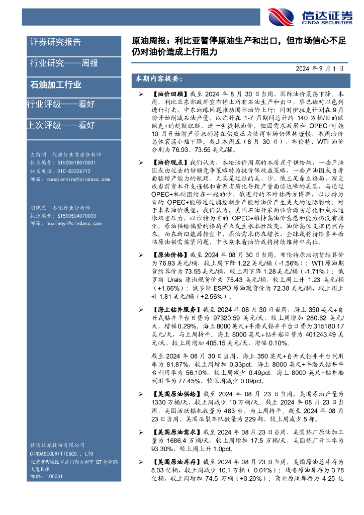 信达证券:行业研究——周报:原油周报:利比亚暂停原油生产和出口,但市场信心不足仍对油价造成上行阻力.pdf